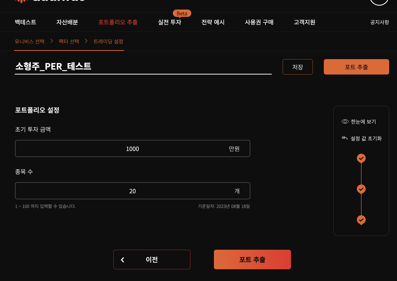 아직은 무료인, 간단한 테스트는 무료인 퀀트투자 사이트가 있다.